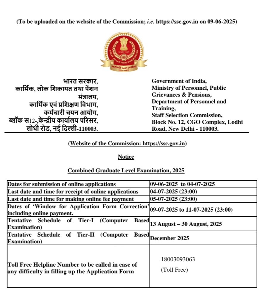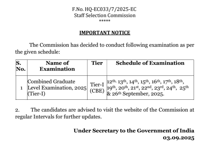 SSC के 9 जून 2025 के नोटिफिकेशन के अनुसार SSC CGL Tier – I परीक्षा 13 अगस्त से 30 अगस्त 2025 तक होने के संभावना जताई गई थी लेकिन अब SSC ने 3 सितंबर 2025 को अपनी ऑफिशल वेबसाइट पर SSC CGL TIER – I परीक्षा की निश्चित तारीख जारी कर दी है। जिसके अनुसार SSC CGL TIER – I की परीक्षाएं 12 सितंबर 2025 से 26 सितंबर 2025 को होनी तय है।